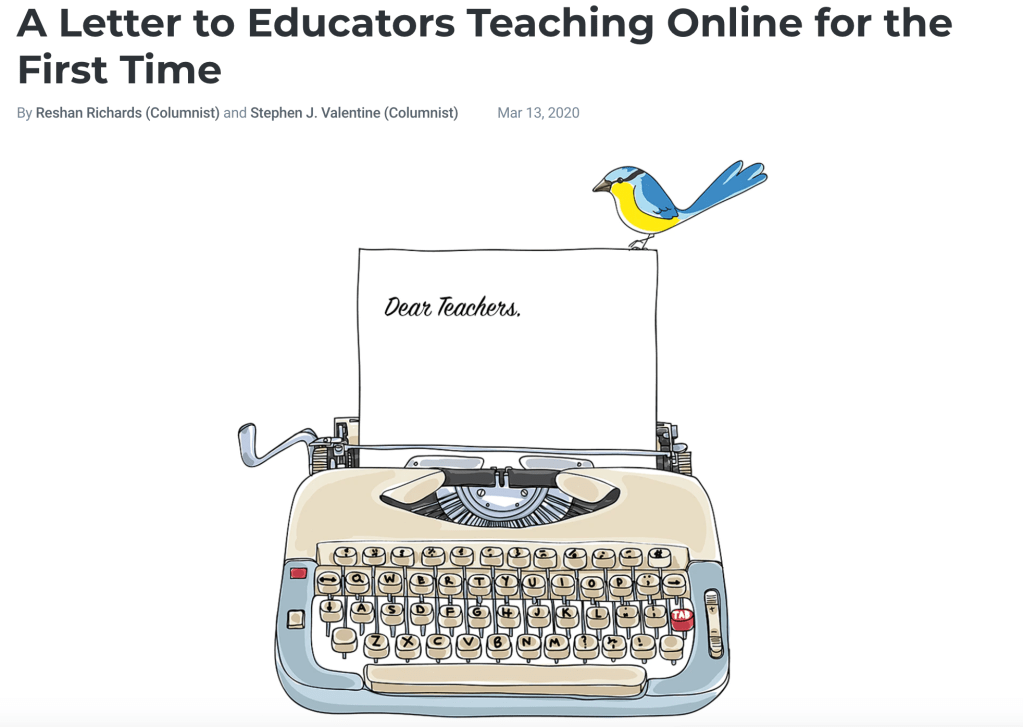 Reshan and I built a single-use website to post this letter to teachers moving online for the first time. Ed Surge published it more widely, and I really love the image they developed for it.